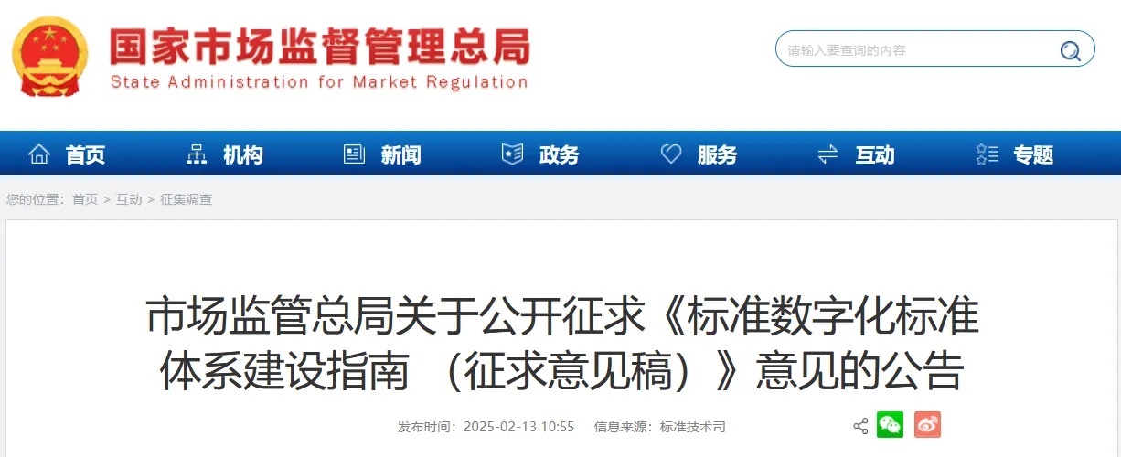 為推動標準化工作向數字化、網絡化、智能化轉型,充分發揮標準的基礎性、引領性作用,市場監管總局起草了《標準數字化標準體系建設指南 (征求意見稿)》(以下簡稱《建設指南》),并向社會公開征求意見,意見反饋截止日期為2025年3月12日。