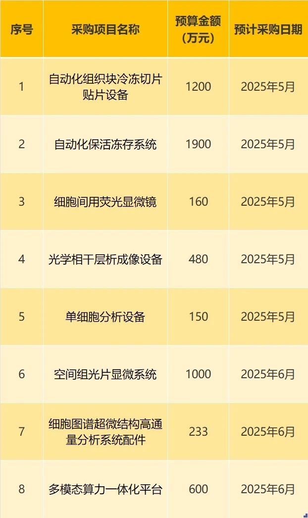 此次的采購(gòu)計(jì)劃包括自動(dòng)化組織塊冷凍切片貼片設(shè)備、自動(dòng)化?;顑龃嫦到y(tǒng)、光學(xué)相干層析成像設(shè)備、單細(xì)胞分析設(shè)備等。這些設(shè)備主要用于組織樣品的冷凍切片、?;顑龃妗⒓?xì)胞觀察與分析、三維結(jié)構(gòu)成像、單細(xì)胞轉(zhuǎn)錄組學(xué)數(shù)據(jù)獲取以及細(xì)胞超微結(jié)構(gòu)研究等方面。