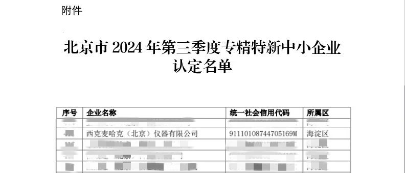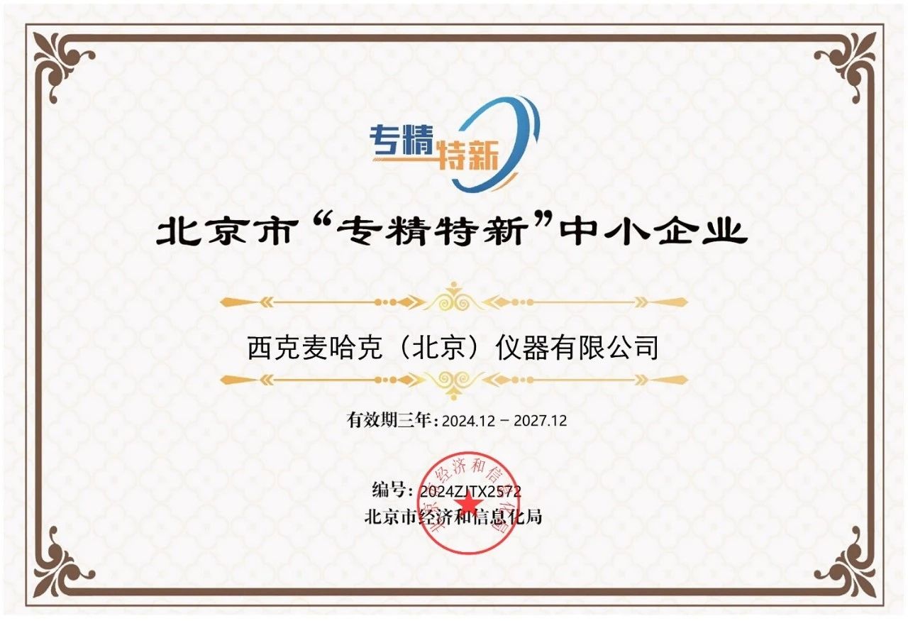 近日,北京市經濟和信息化局發布2024年度第三季度專精特新中小企業名單。西克麥哈克(北京)儀器有限公司憑借領先的技術能力,豐富的應用經驗與不懈的創新精神獲評北京市“專精特新”中小企業。