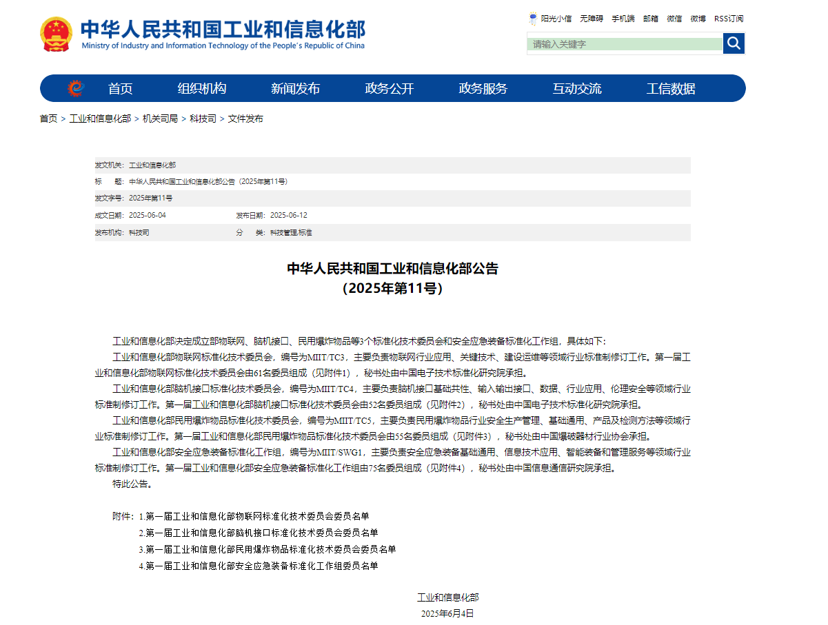 6月12日,工業(yè)和信息化部發(fā)布重要公告,宣布成立物聯(lián)網(wǎng)、腦機接口、民用爆炸物品三個標準化技術(shù)委員會以及安全應(yīng)急裝備標準化工作組。這一舉措旨在進一步規(guī)范相關(guān)領(lǐng)域的行業(yè)標準,促進技術(shù)創(chuàng)新與產(chǎn)業(yè)升級,提升我國在全球市場的競爭力。