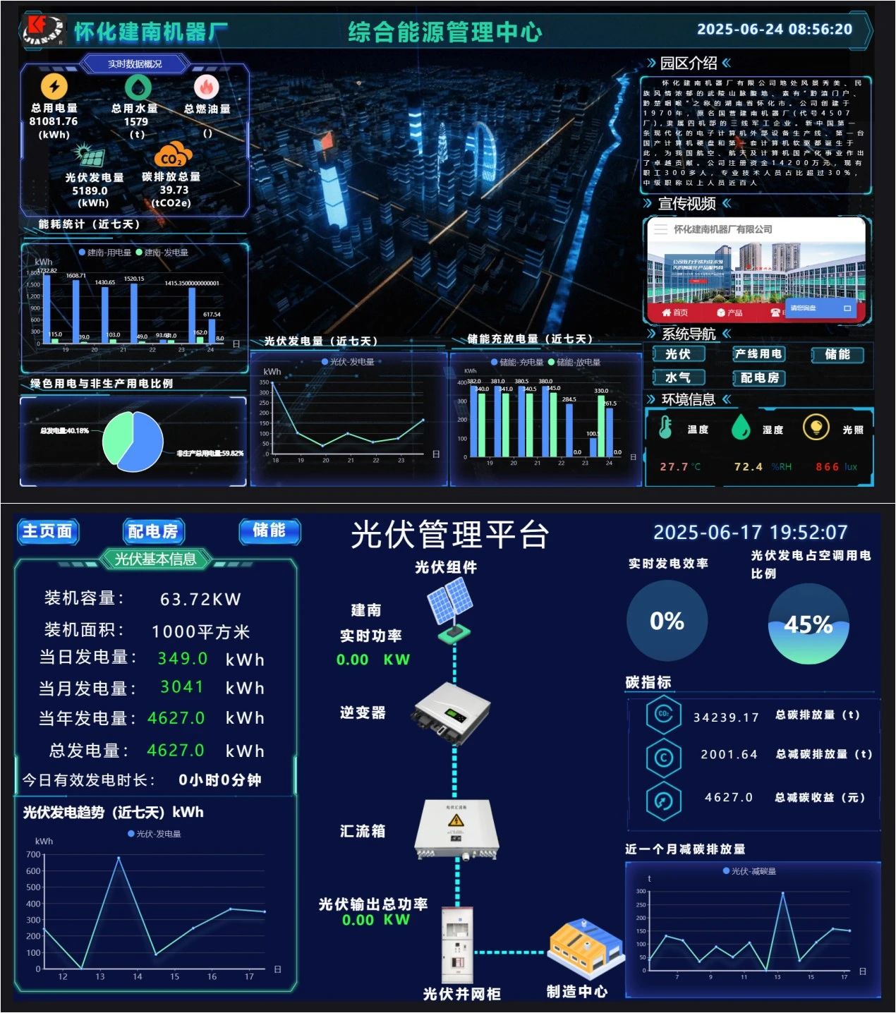 綜合能源管理平臺部署在公司一樓展廳,智能LCD大屏實時動態(tài)顯示園區(qū)發(fā)電及用電耗能情況,平臺軟件部署在云端。公司實現(xiàn)了生產(chǎn)用電與非生產(chǎn)用電分開監(jiān)測,完成了各車間、各部門水電氣熱數(shù)據(jù)采集,并監(jiān)測重點設(shè)備能源使用情況。該管理平臺無論從整體架構(gòu)還是軟件開發(fā),全部由建南自主研發(fā)實施。智能微電網(wǎng)項目實施后,公司外部購電量降低了約30%,實現(xiàn)了節(jié)能與綠色環(huán)保。