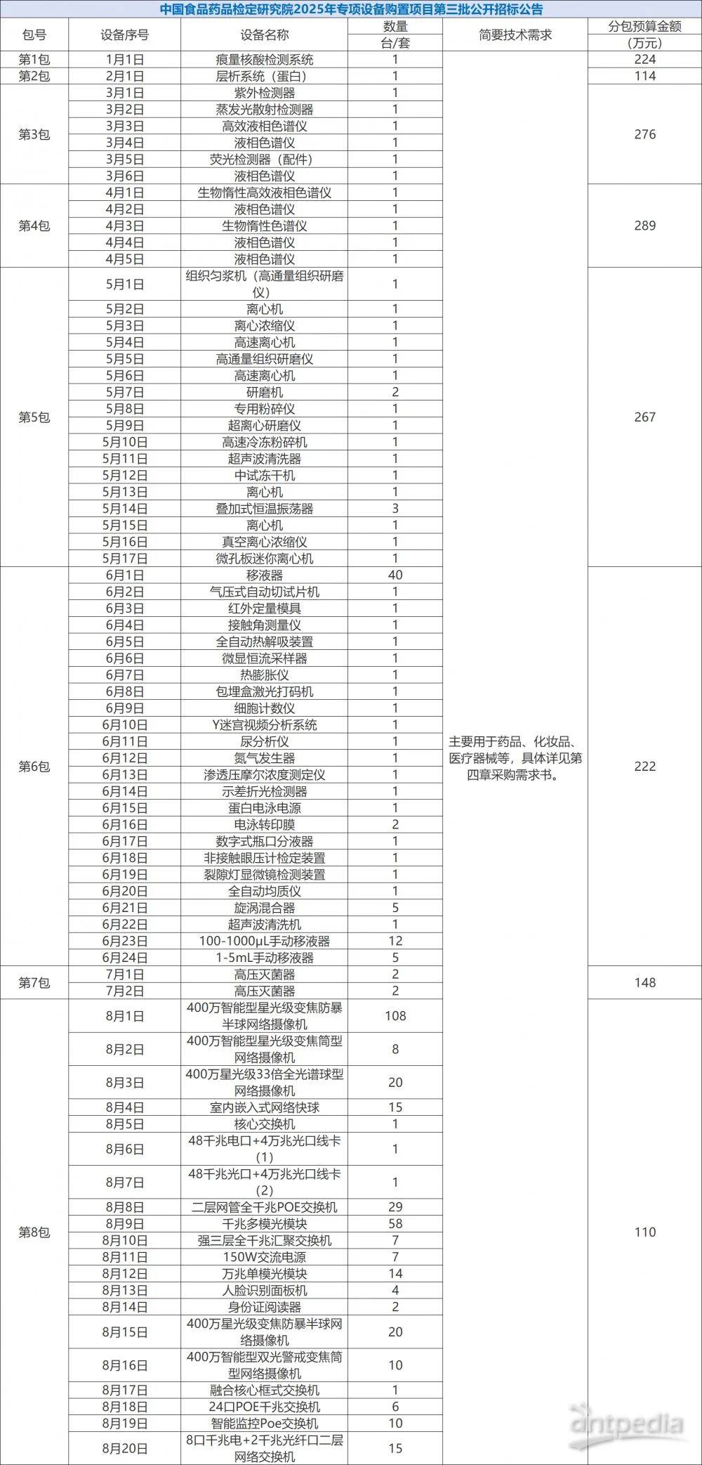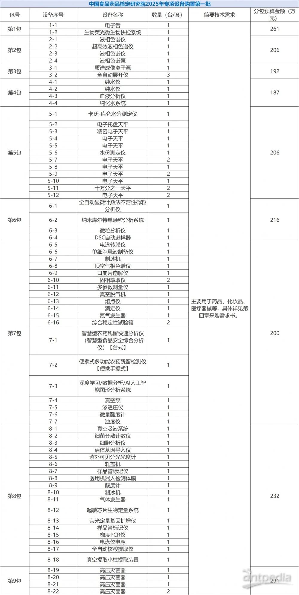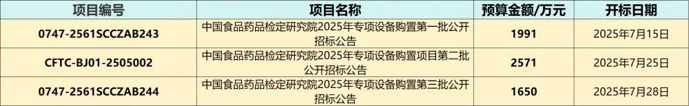 中國政府采購網消息,近日,中國食品藥品檢定研究院就2025年專項設備購置項目分別于624日和74日發布招標公告,招標總金額為6212萬元,采購的儀器設備共計605/套,包括超高效液相色譜儀、生物熒光微生物快檢系統、小動物活體成像系統等。
