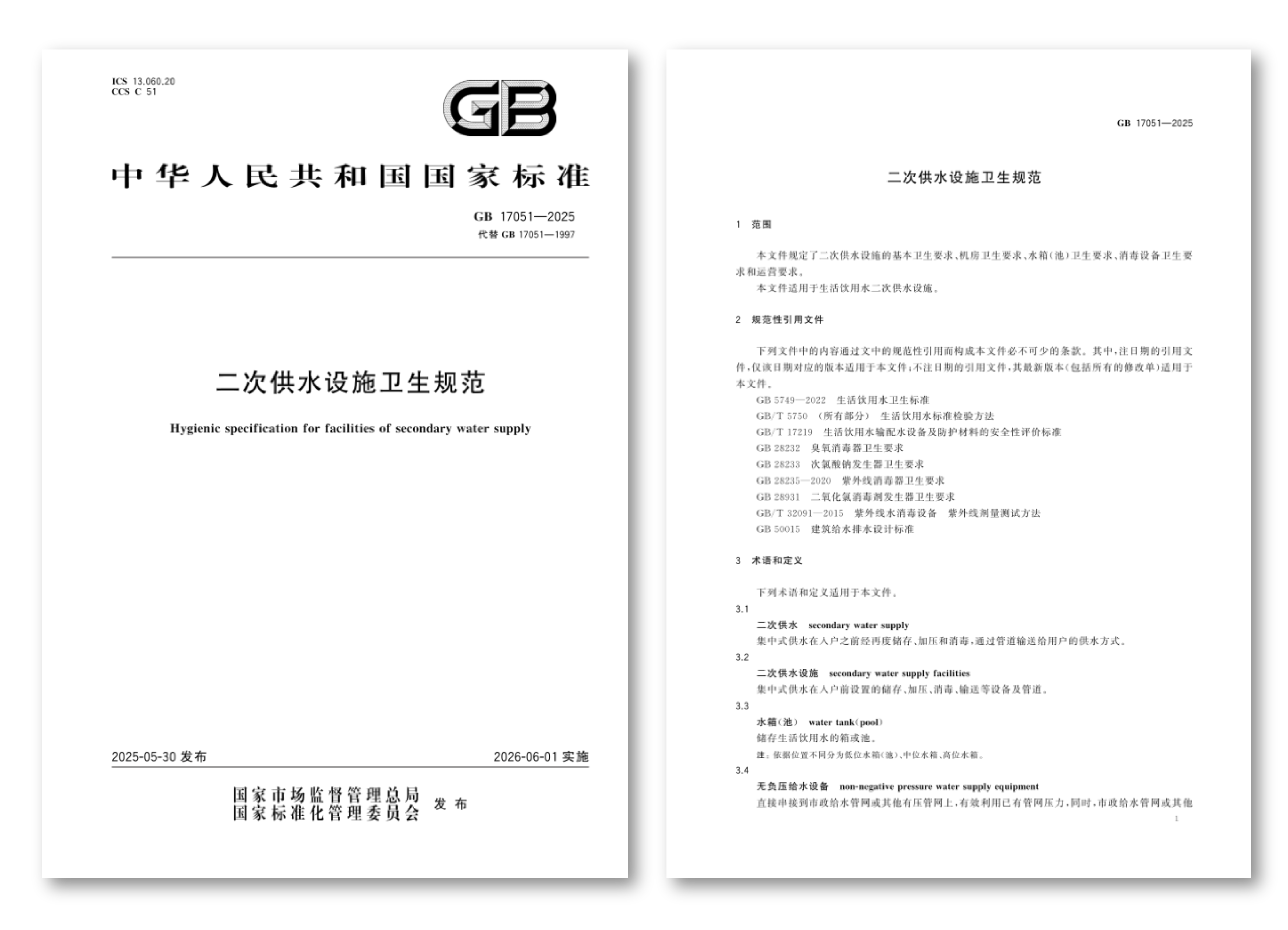 GB 17051-2025二次供水設(shè)施衛(wèi)生規(guī)范,2025-05-30 發(fā)布,2026-06-01實(shí)施。此標(biāo)準(zhǔn)規(guī)定了二次供水設(shè)施的基本衛(wèi)生要求、機(jī)房衛(wèi)生要求、水箱(池)衛(wèi)生要求、消毒設(shè)備衛(wèi)生要求和運(yùn)營要求。此標(biāo)準(zhǔn)適用于生活飲用水二次供水設(shè)施。