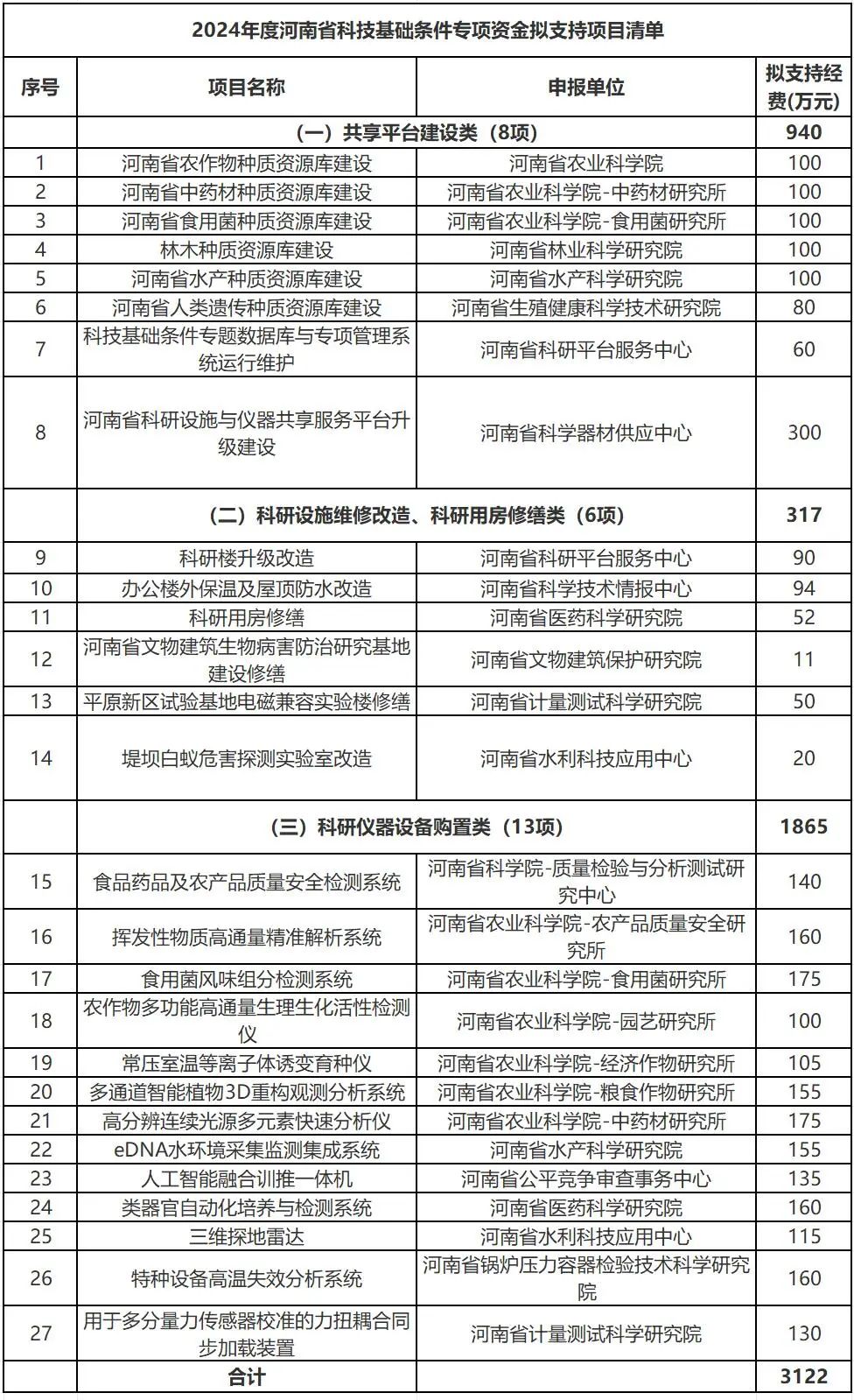 河南省科學技術廳對2025年度省科技基礎條件專項資金擬支持項目公示。擬支持項目清單含327個項目,擬支持經費共計3122萬元。其中,共享平臺建設類(8項)940萬元,科研設施維修改造、科研用房修繕類(6項)317萬元,科研儀器設備購置類(13項)1865萬元。