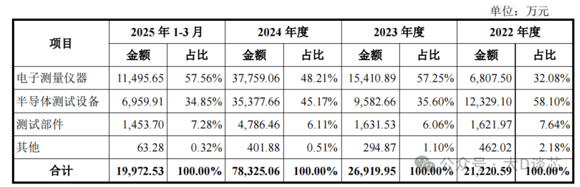 公司產(chǎn)品主要包括電子測(cè)量?jī)x器和半導(dǎo)體測(cè)試設(shè)備,以及配套的測(cè)試部件及服務(wù)。2025年1-3月電子測(cè)量?jī)x器的營(yíng)業(yè)收入金額為11495.65萬(wàn)元,占比57.56%;半導(dǎo)體測(cè)試設(shè)備的營(yíng)業(yè)收入為6959.91萬(wàn)元,占比34.85%。