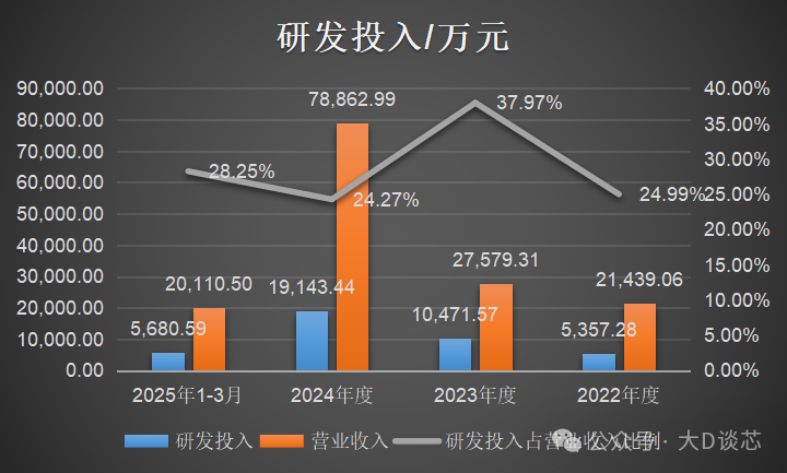 2022年至2025年3月,公司研發(fā)費(fèi)用金額分別為5,357.28萬(wàn)元、10,471.57萬(wàn)元、19,143.44萬(wàn)元和5,680.59萬(wàn)元,占營(yíng)業(yè)收入的比例分別為24.99%、37.97%、24.27%和28.25%,