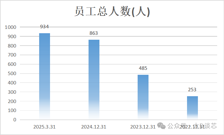 2022年至2025年3月,公司員工總?cè)藬?shù)隨著業(yè)務(wù)的發(fā)展也在不斷增加,人數(shù)分別是253、485、863和934。