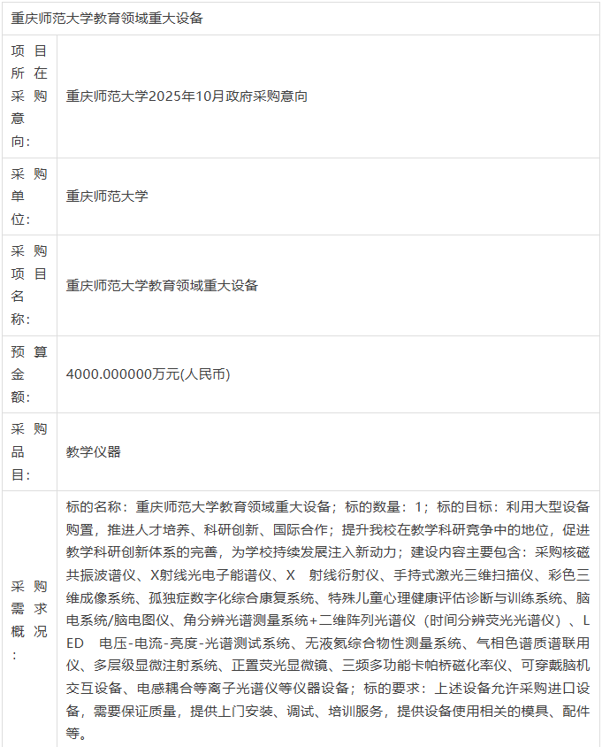重慶師范大學2025年10月政府采購意向-重慶師范大學教育領域重大設備 詳細情況