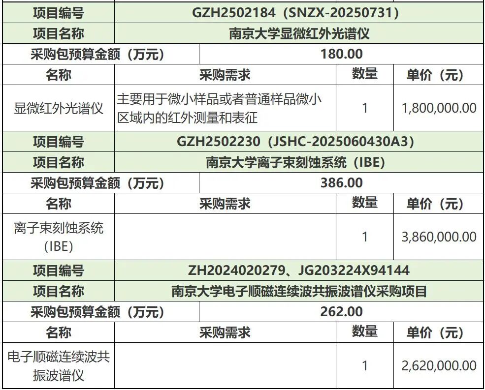 近日,南京大學多個科研儀器設備招標項目發布,采購包括激光剝蝕電感耦合等離子體串聯質譜儀、球差校正透射電鏡、冷凍雙束電鏡、飛秒激光高分辨全元素分析系統,熱重紅外氣相色譜質譜聯用儀、傅立葉變換離子回旋共振質譜、硬X射線光電子能譜儀、高通量組織成像-多組學高分辨質譜系統、場發射電子探針顯微分析儀、顯微紅外光譜儀等,總采購金額超1.45億元。