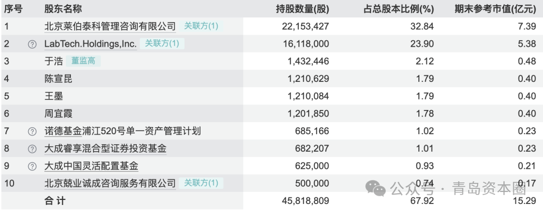 截至 2025 年半年度報告期末,萊伯泰科股東總數為3635戶。從主要股東來看,北京萊伯泰科管理咨詢有限公司為公司控股股東,持股數量 2215.34 萬股,持股比例 32.84%;LabTech Holdings, Inc. 為第二大股東,持股 1611.80 萬股,持股比例 23.90%;此外,于浩、陳宣昆、王墨等自然人股東及諾德基金、大成基金等機構股東也持有一定比例股份。青島市創新投資有限公司本次戰略入股后,將成為公司第三大股東。