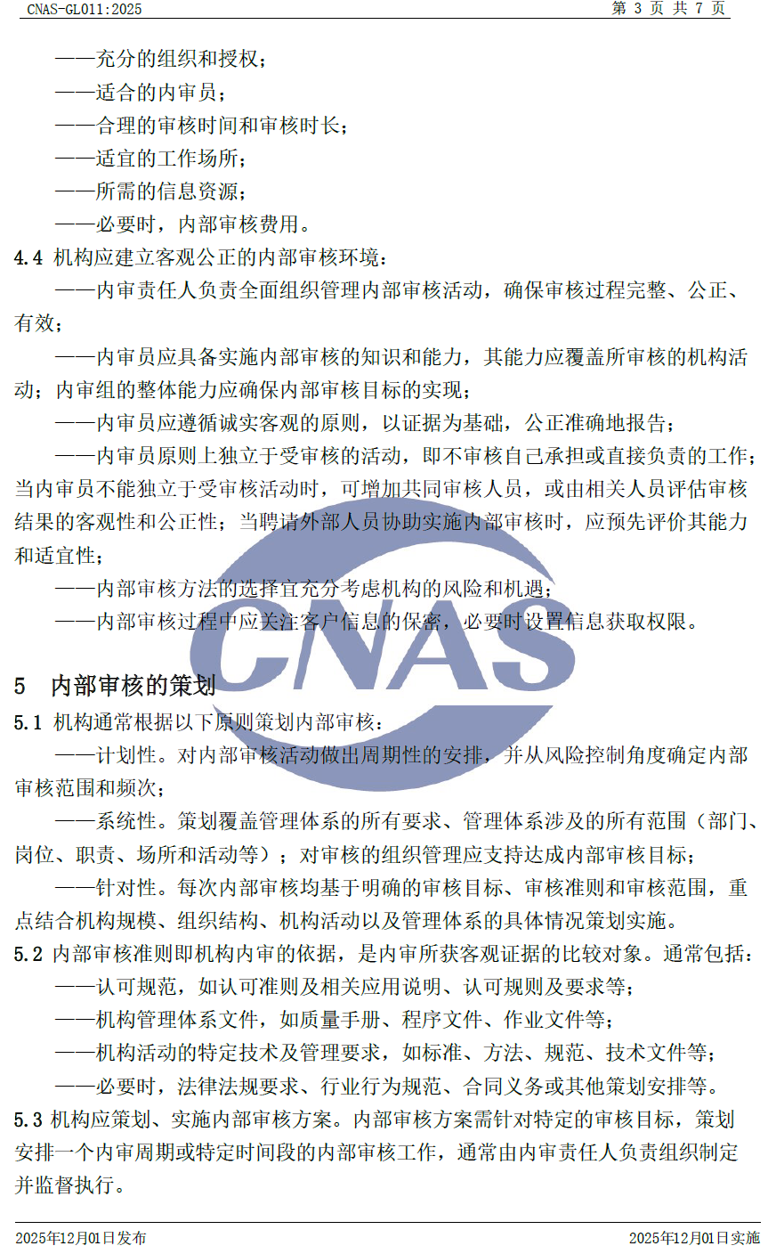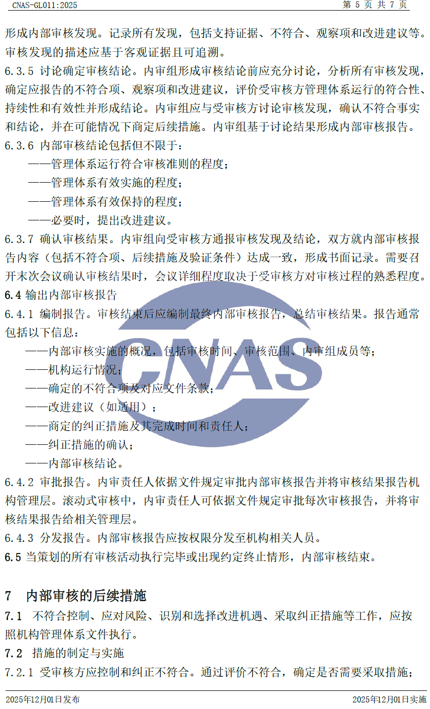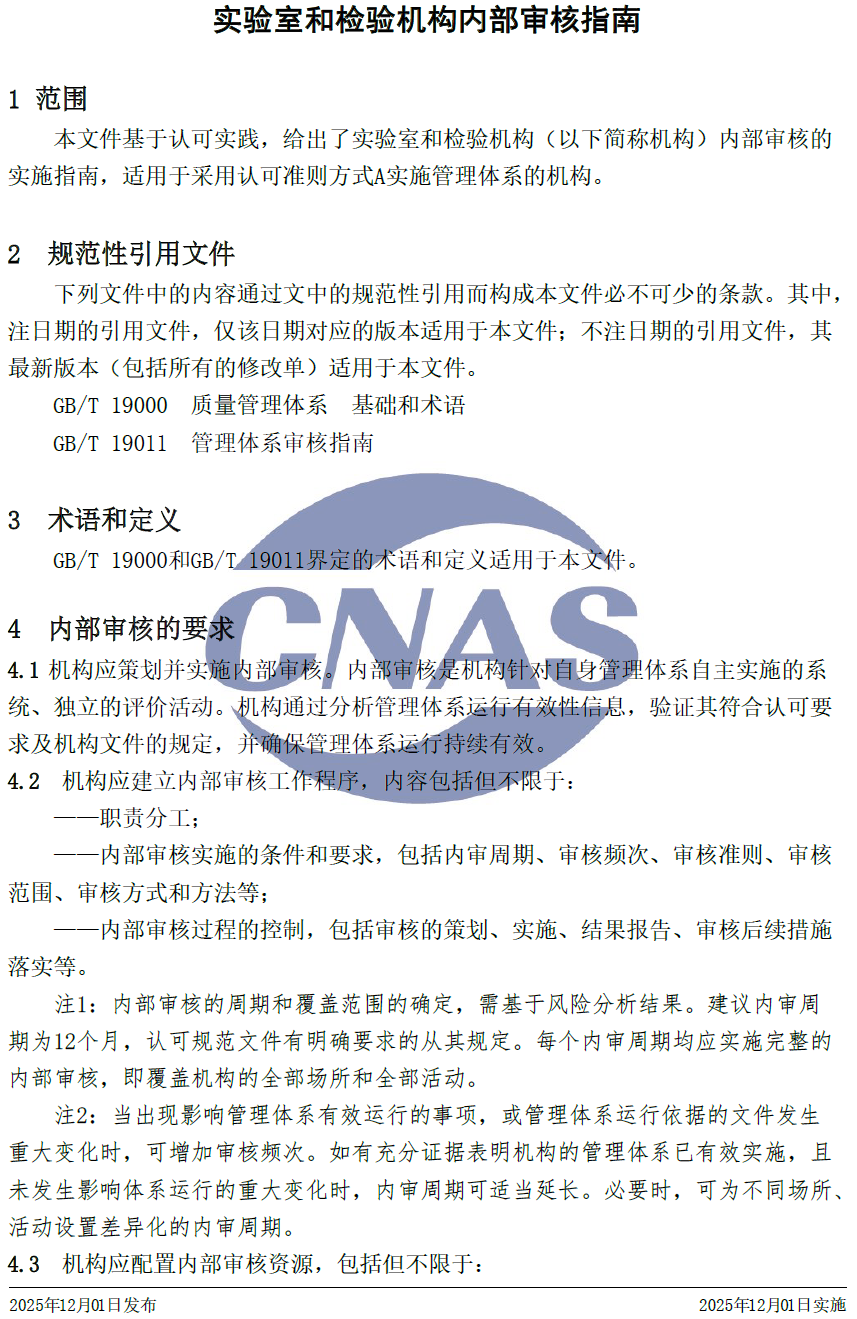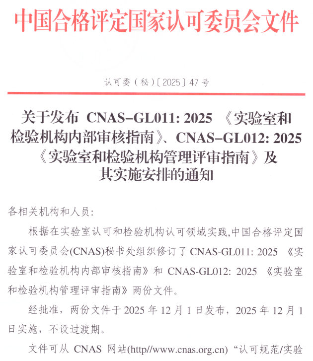 CNAS-GL011:2025 《實驗室和檢驗機構(gòu)內(nèi)部審核指南》與CNAS-GL011:2018相比,除結(jié)構(gòu)調(diào)整和編輯性改動外,主要技術(shù)變化如下: