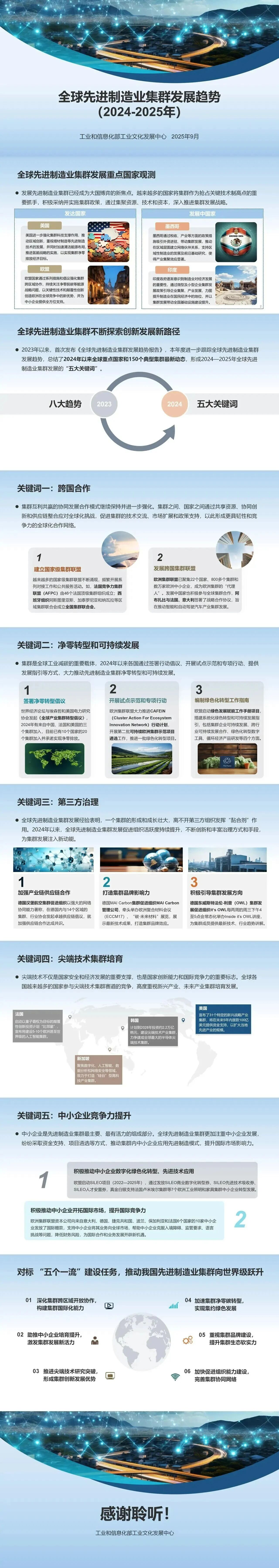 先進(jìn)制造業(yè)集群是制造業(yè)高質(zhì)量發(fā)展的核心趨勢(shì),也是制造強(qiáng)國(guó)戰(zhàn)略布局的關(guān)鍵重點(diǎn),對(duì)推進(jìn)新型工業(yè)化、保障產(chǎn)業(yè)鏈供應(yīng)鏈安全、構(gòu)筑大國(guó)經(jīng)濟(jì)安全屏障具有重要意義。黨中央、國(guó)務(wù)院高度重視其培育發(fā)展,習(xí)近平總書記作出系列重要指示,黨的二十屆三中全會(huì)也提出明確要求。在新一輪科技革命和產(chǎn)業(yè)變革深入演進(jìn)、全球產(chǎn)業(yè)鏈供應(yīng)鏈加速重構(gòu)的背景下,課題組以全球 150 個(gè)典型集群為跟蹤樣本,延續(xù)往年研究基礎(chǔ),梳理 2024 年以來(lái)全球重點(diǎn)國(guó)家及集群最新動(dòng)態(tài),提煉出五大年度關(guān)鍵詞,并形成我國(guó)集群培育提升的相關(guān)建議,為政府、相關(guān)組織及企業(yè)提供參考。