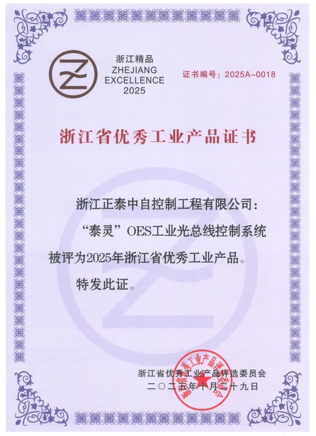 近日,浙江省優(yōu)秀工業(yè)產(chǎn)品評(píng)選委員會(huì)公布2025年浙江省優(yōu)秀工業(yè)產(chǎn)品名單,浙江正泰中自控制工程有限公司"泰靈"OES工業(yè)光總線控制系統(tǒng)憑借優(yōu)異的產(chǎn)品力從參加評(píng)審的產(chǎn)品中脫穎而出,成功入選2025 年浙江省優(yōu)秀工業(yè)產(chǎn)品名單,成為浙江優(yōu)質(zhì)工業(yè)的代言產(chǎn)品。