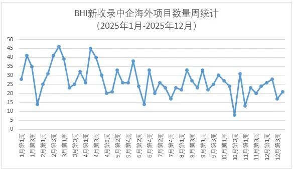 BHI中企海外項目數據庫監測,上周(1222-26日)BHI新收錄中企新簽約/中標/公告海外項目21個,較此前小幅回升。其中中國交建7個項目、中國能建6個項目。2025年新收錄項目超過1340個。近一年每周新收錄項目數量趨勢統計詳見下圖。