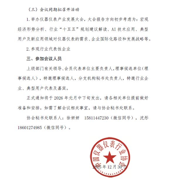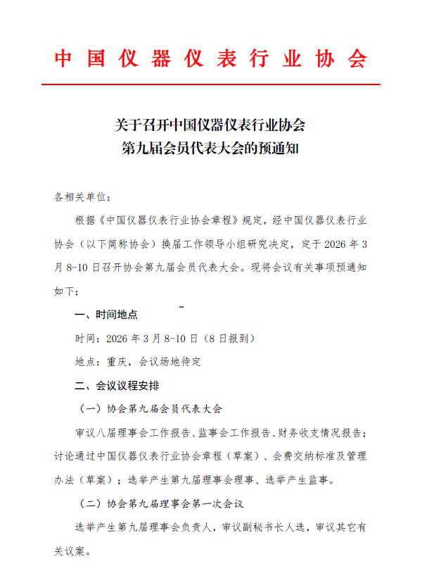 根據(jù)《中國儀器儀表行業(yè)協(xié)會章程》規(guī)定,經(jīng)中國儀器儀表行業(yè)協(xié)會(以下簡稱協(xié)會)換屆工作領(lǐng)導小組研究決定,定于2026 年3月8-10 日召開協(xié)會第九屆會員代表大會。現(xiàn)將會議有關(guān)事項預通知如下: