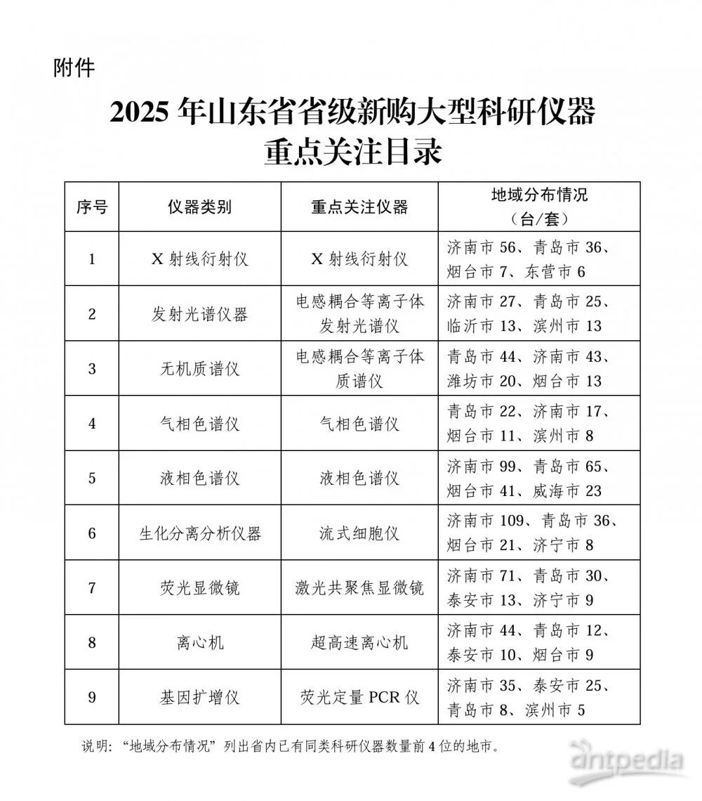 近日,山東省科學技術廳、山東省教育廳依托省大型科研儀器開放共享服務網數據,組織專家進行分析論證,對原值 50 萬元及以上大型科研儀器保有量、購置年限、使用績效、共享情況等核心指標進行定量分析與綜合研判,編制了《2025 年山東省省級新購大型科研儀器重點關注目錄》,X射線衍射儀、電感耦合等離子體發射光譜儀、電感耦合等離子體質譜儀、氣相色譜儀、液相色譜儀、流式細胞儀、激光共聚焦顯微鏡、超高速離心機、熒光定量PCR儀等9類儀器入選重點關注儀器。