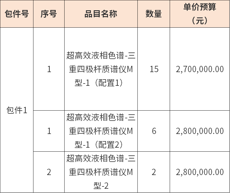 根據(jù)公告信息,采購(gòu)超高效液相色譜-三重四極桿質(zhì)譜儀M型-1(配置1)15臺(tái)套,超高效液相色譜-三重四極桿質(zhì)譜儀M型-1(配置2)6臺(tái)套,超高效液相色譜-三重四極桿質(zhì)譜儀M型-2采購(gòu)2臺(tái)套。產(chǎn)品需交付至海關(guān)指定地點(diǎn),時(shí)間不得超過(guò)正式簽訂合同后30個(gè)日歷日,并提供為期三年的質(zhì)保服務(wù)。