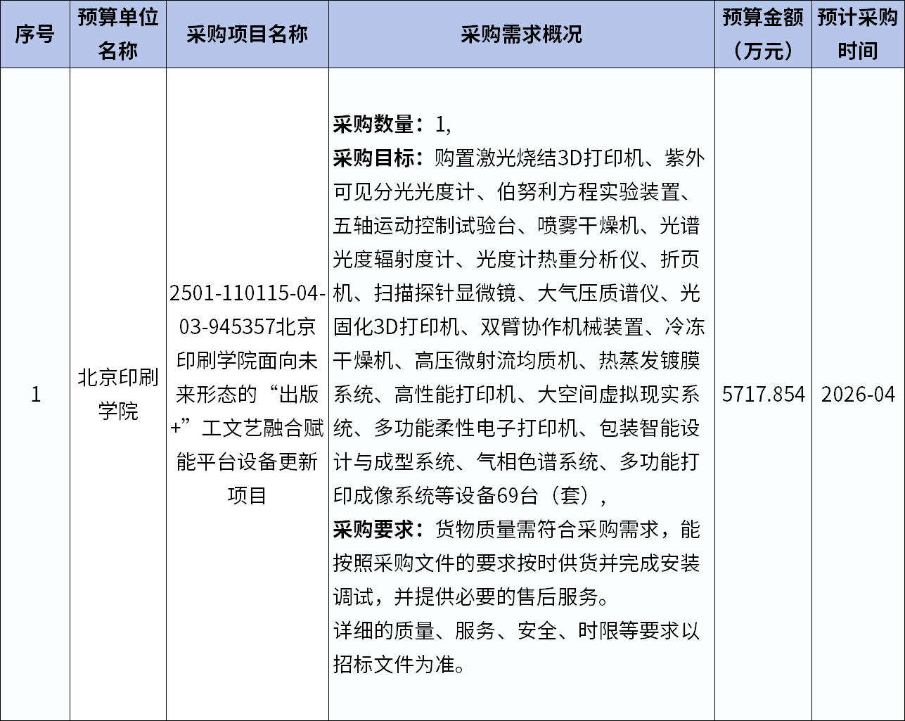 北京印刷學(xué)院面向未來形態(tài)的“出版+”工文藝融合賦能平臺(tái)設(shè)備更新項(xiàng)目公開,計(jì)劃購(gòu)置激光燒結(jié)3D打印機(jī)、紫外可見分光光度計(jì)、伯努利方程實(shí)驗(yàn)裝置、五軸運(yùn)動(dòng)控制試驗(yàn)臺(tái)、噴霧干燥機(jī)、光譜光度輻射度計(jì)等69臺(tái)(套)設(shè)備,預(yù)算金額5717.854萬元,預(yù)計(jì)2026年4月采購(gòu)。