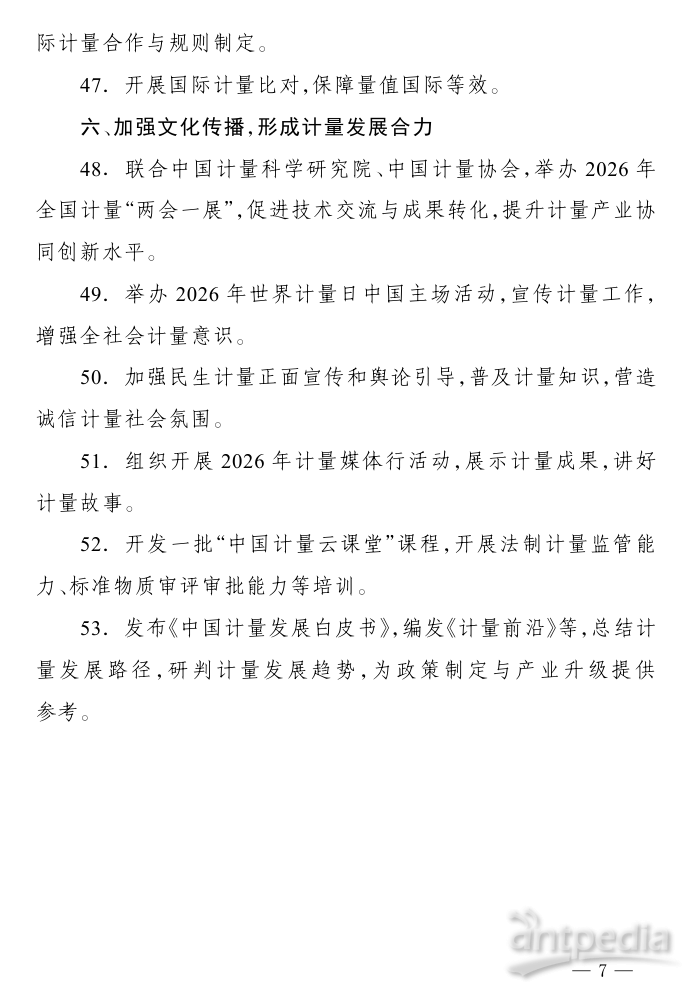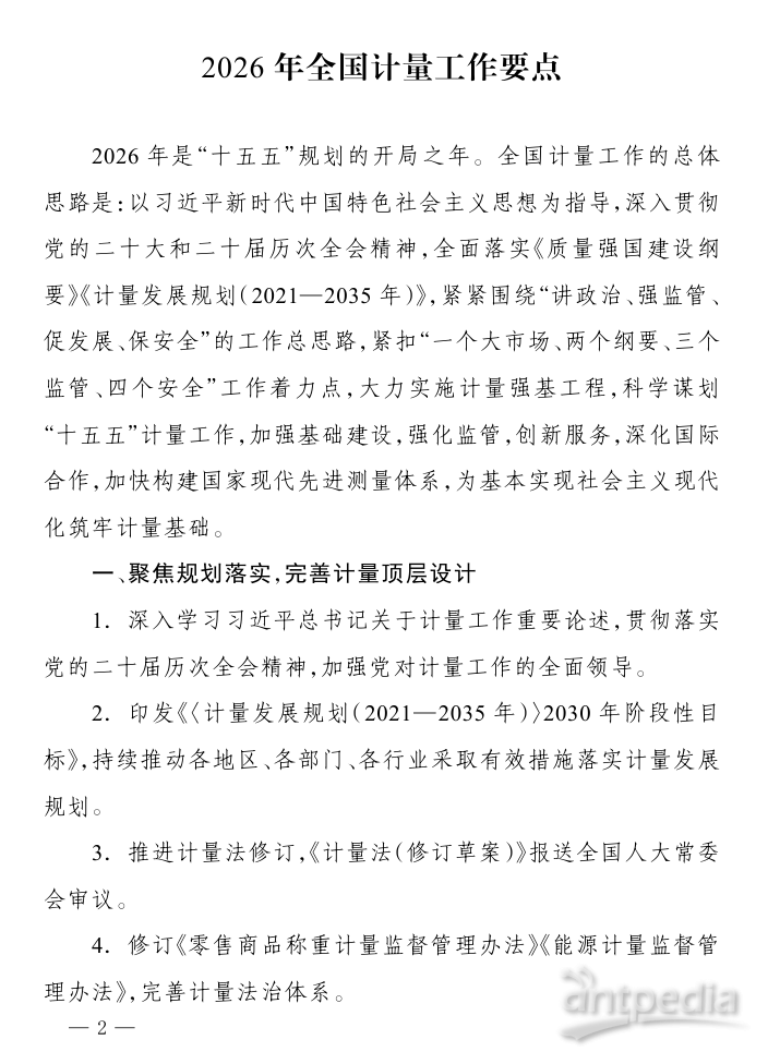 2026年,全國計量工作主要圍繞六個方面開展:聚焦規(guī)劃落實,完善計量頂層設(shè)計;加強基礎(chǔ)建設(shè),提升計量保障能力;創(chuàng)新監(jiān)管模式,守牢計量公正底線;圍繞戰(zhàn)略需求,優(yōu)化計量服務(wù)支撐;深化國際合作,推動計量高水平對外開放;加強文化傳播,形成計量發(fā)展合力。具體包括推進計量法修訂,圍繞新技術(shù)、新產(chǎn)業(yè)、新業(yè)態(tài)建設(shè)一批計量技術(shù)委員會等內(nèi)容。