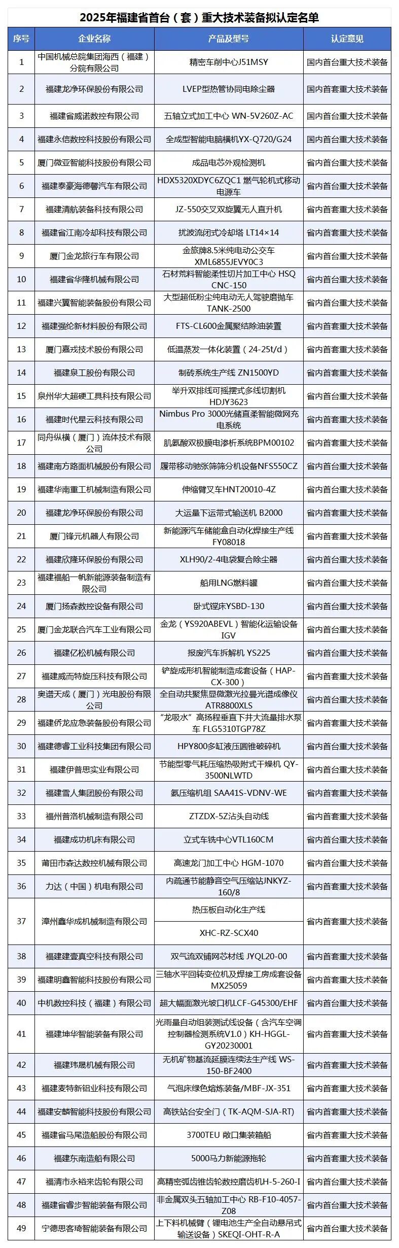 福建省工信廳公示2025年福建省首臺(套)重大技術裝備認定名單49家企業上榜一起來看下具體名單。