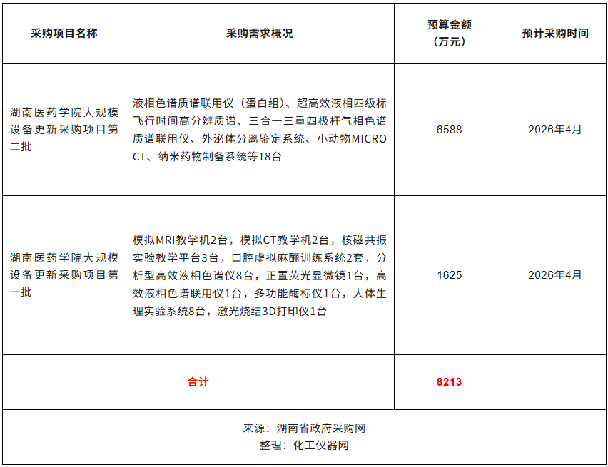 近日,湖南醫(yī)藥學(xué)院公布2026年2季度采購意向,計(jì)劃采購液相色譜質(zhì)譜聯(lián)用儀、外泌體分離鑒定系統(tǒng)、核磁共振實(shí)驗(yàn)教學(xué)平臺(tái)、分析型高效液相色譜儀、正置熒光顯微鏡、多功能酶標(biāo)儀等47臺(tái)儀器設(shè)備,預(yù)算總金額8213萬元。預(yù)計(jì)采購時(shí)間2026年4月。